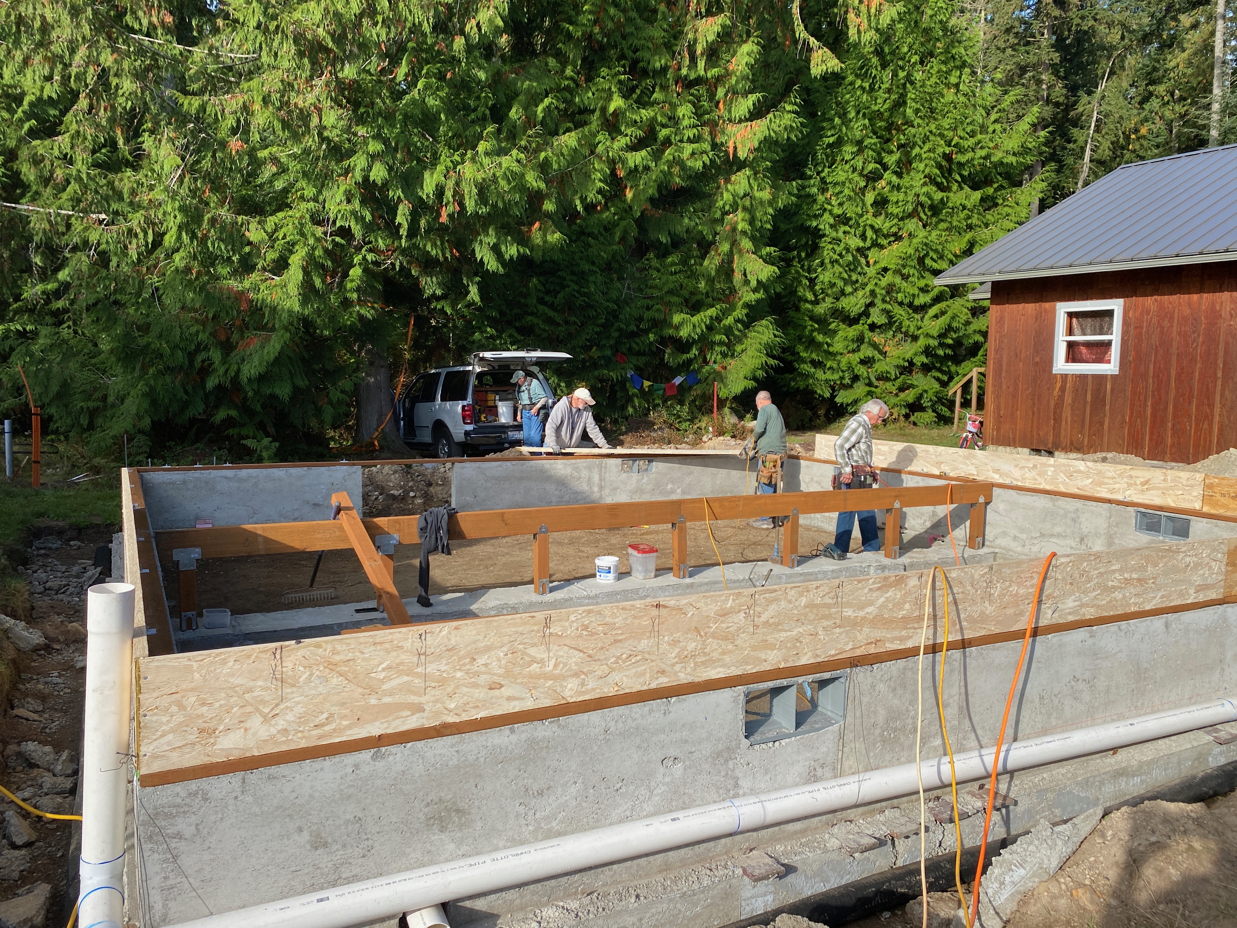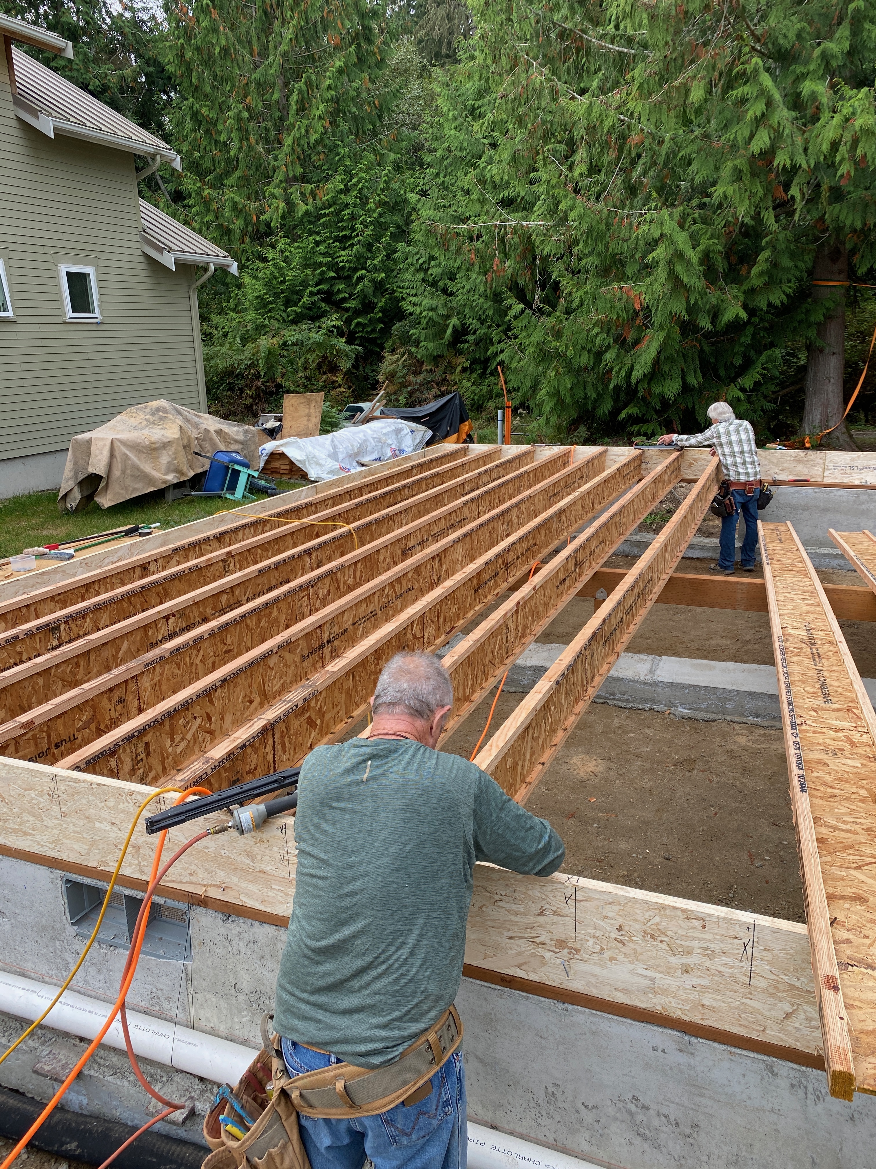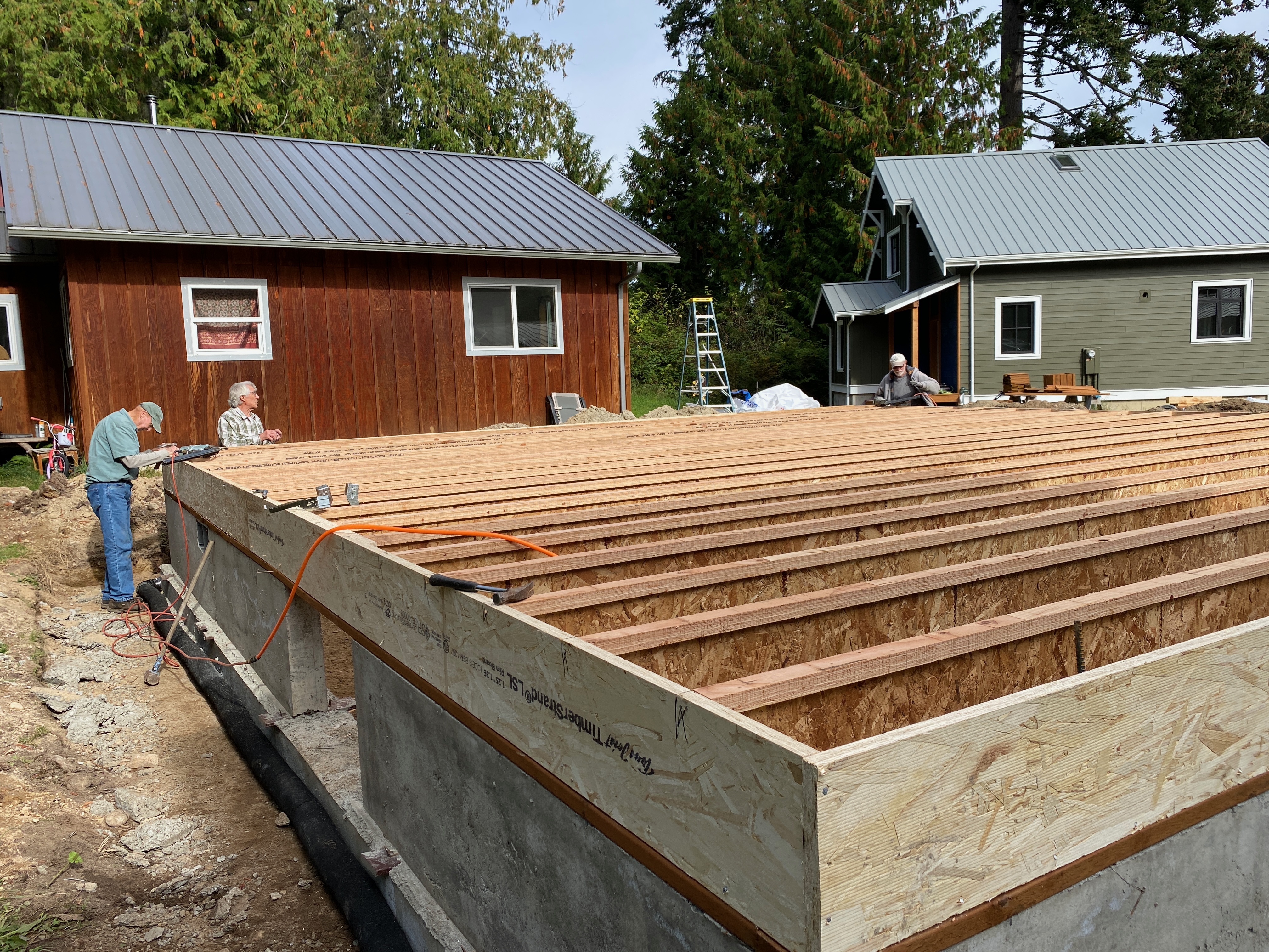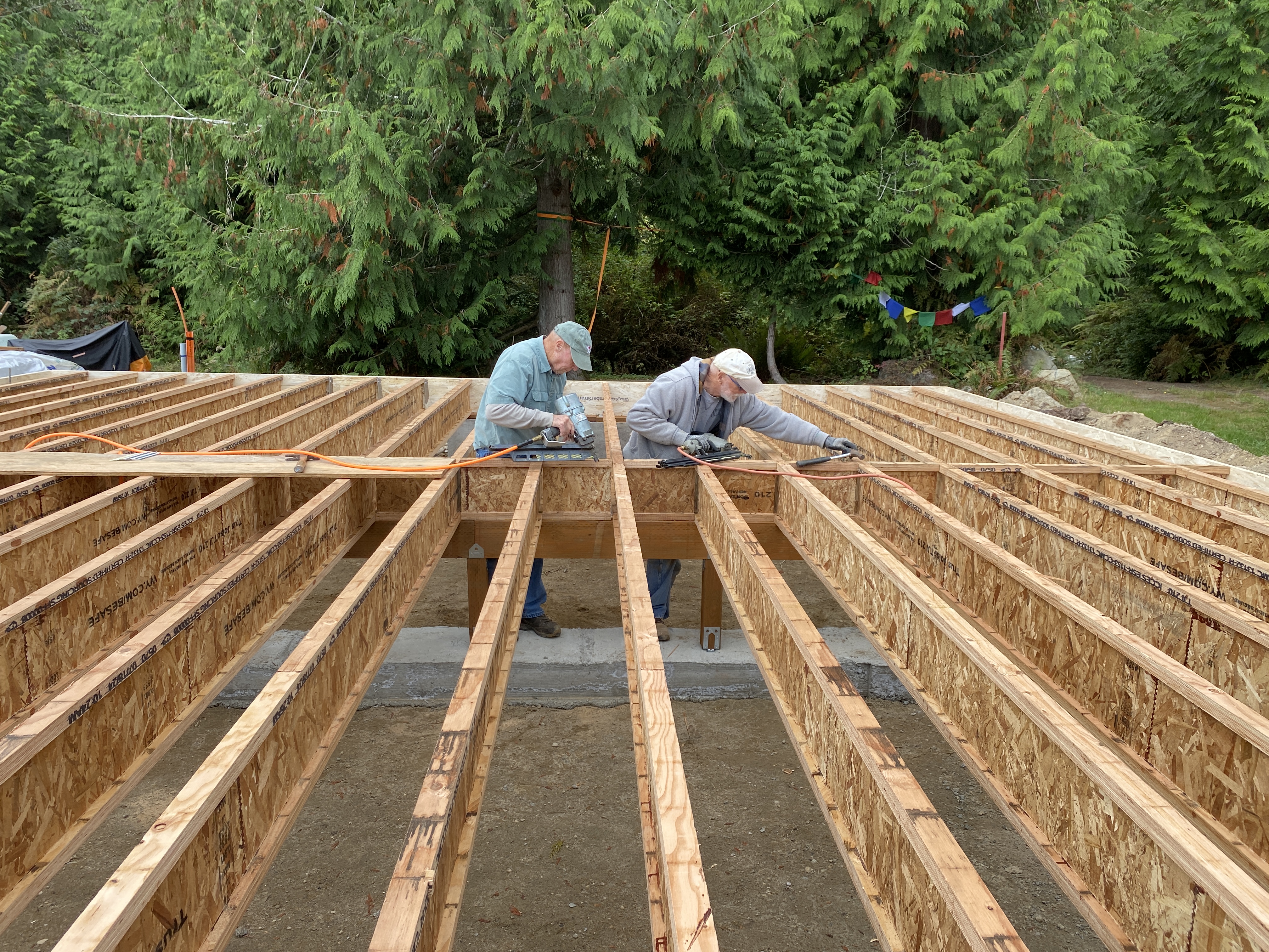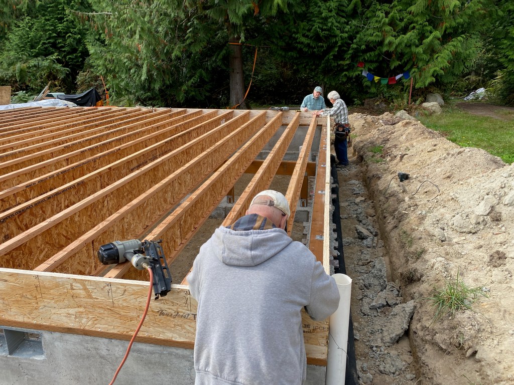 A dynamite crew of experienced volunteer carpenters, Bob Dalton, Richard Epstein, George Julius and Mike Sheneman, have now set all the floor joists!