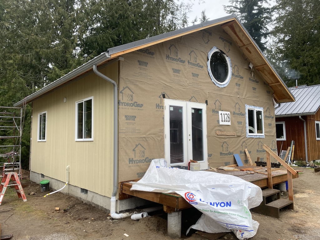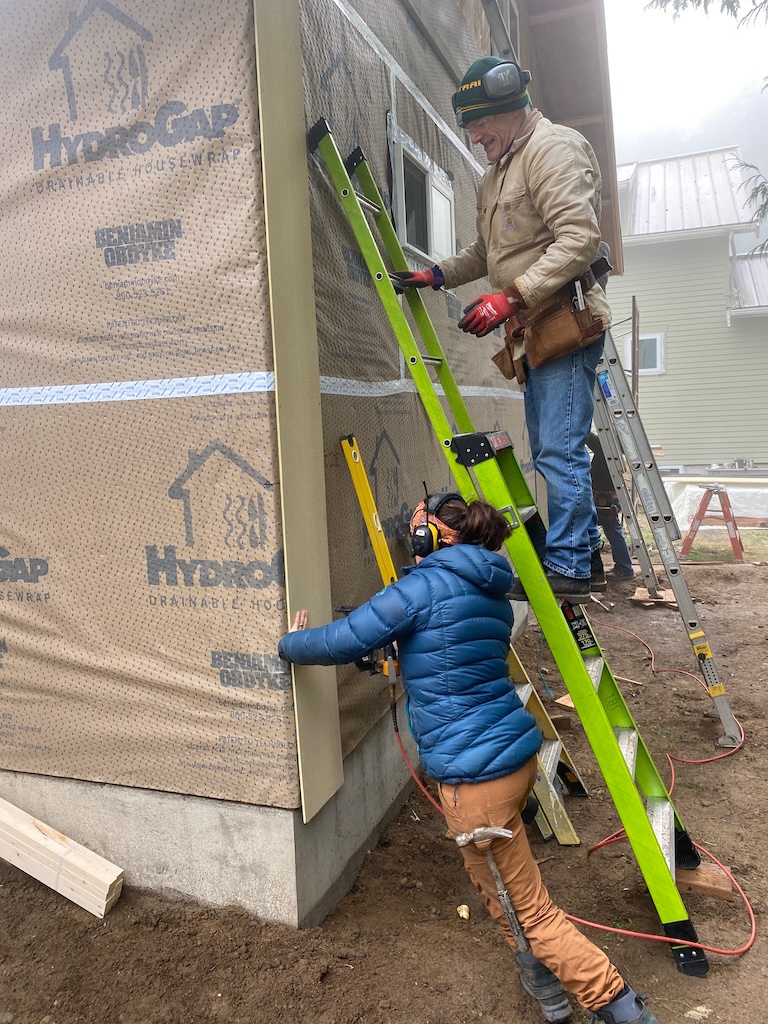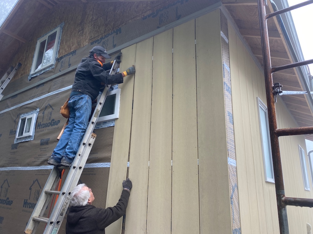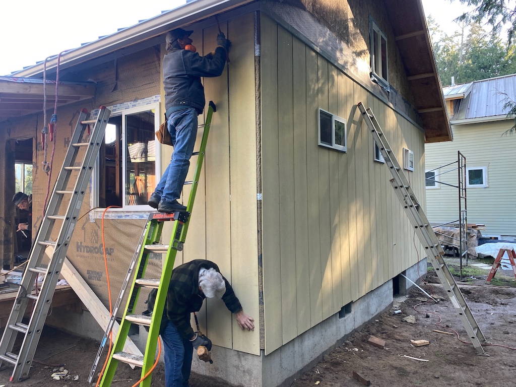 This week’s wonderful home-raising crew of Bob Dalton, Richard Epstein, Peter Oakley, George Julius, Scott Connor, Dave Wingen, Joe Schwab, and Melissa Farage finished the siding on the south and west sides, and most of the east side. Appreciation to Gabbi Korrow, Karol White and Christine Epstein who provided the hearty lunches and delicious treats and scones!