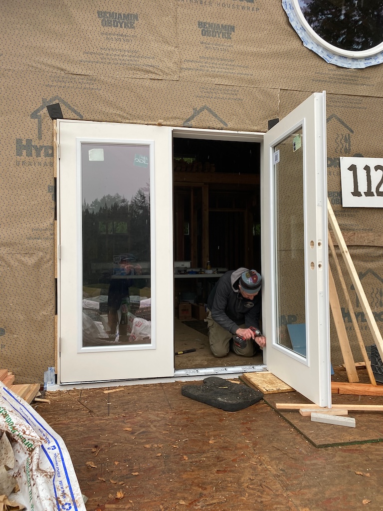 The doors were also installed! Appreciations to Building Source who donated a door jamb and discounted the french door on the front, Richard for procuring a donated door for the north entrance from the side porch, and to Bob and Richard for installing them!