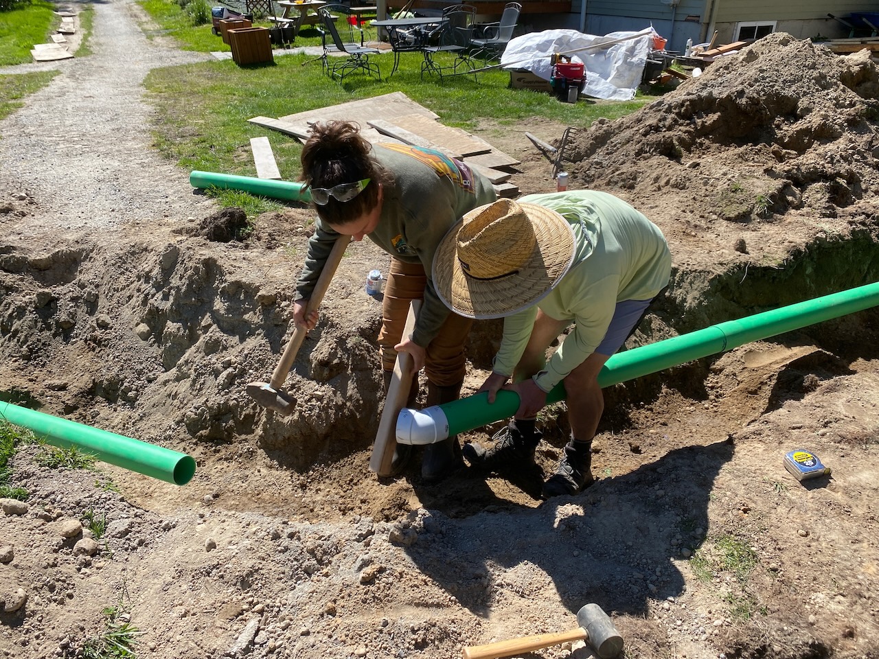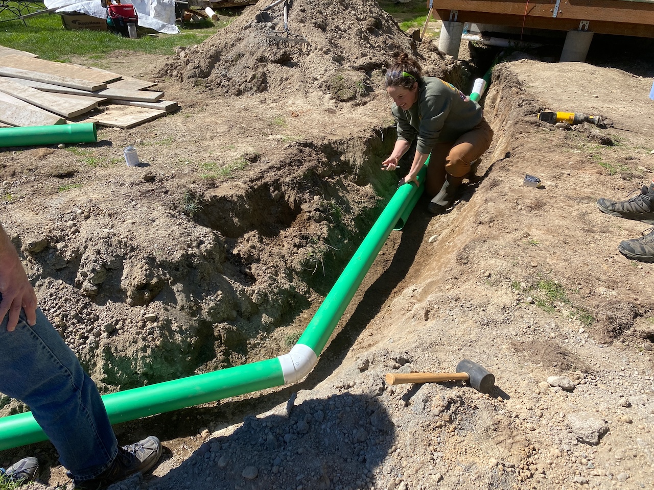 Outside, Wade Wilcox, Earth Rhythms, dug the trenches for the sewer line, and the dry well. Melissa Farage and Josh Pettersen installed the sewer line. George Julius finished the connection with main line, and also installed the gutter drainpipes, with help from Dave Wingen.