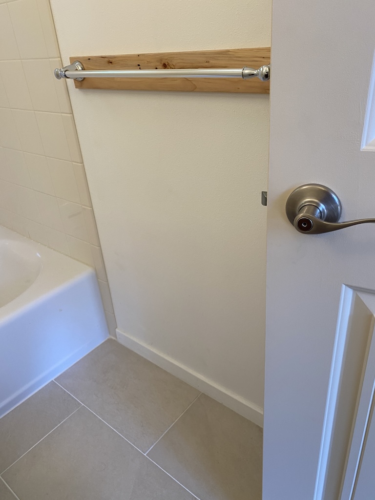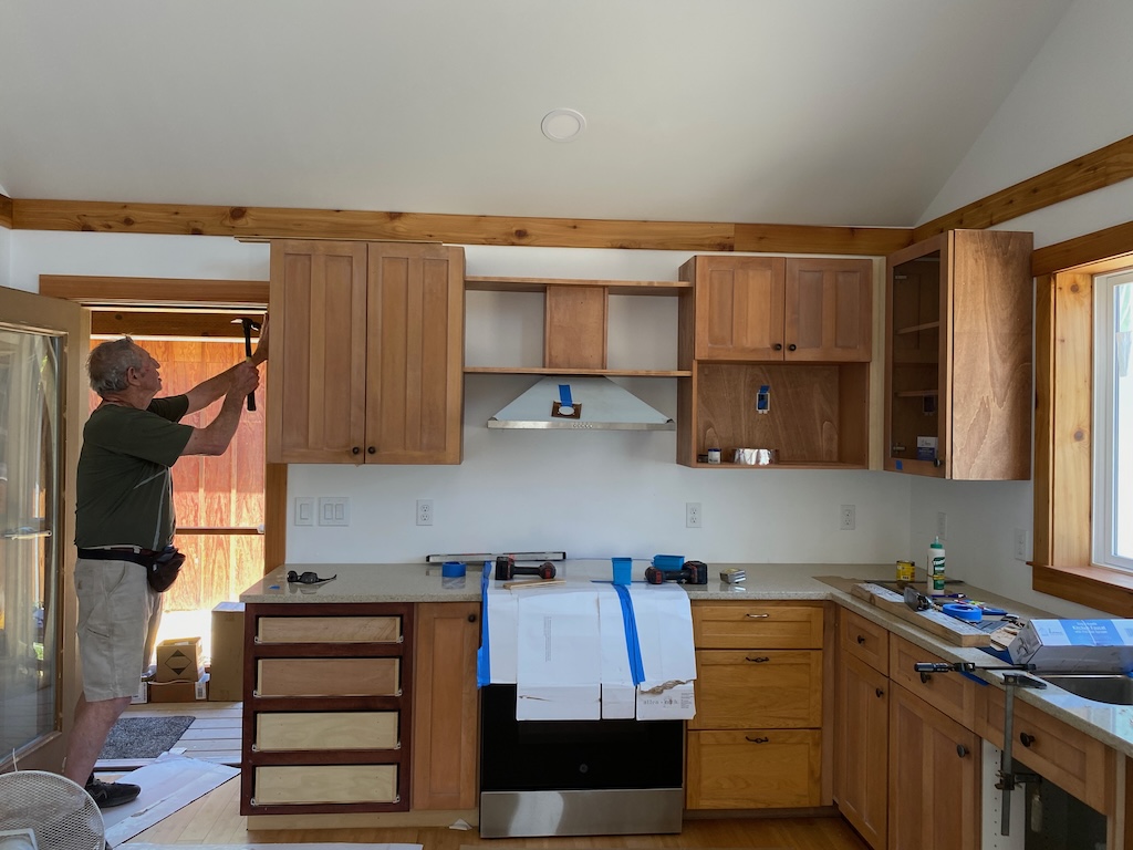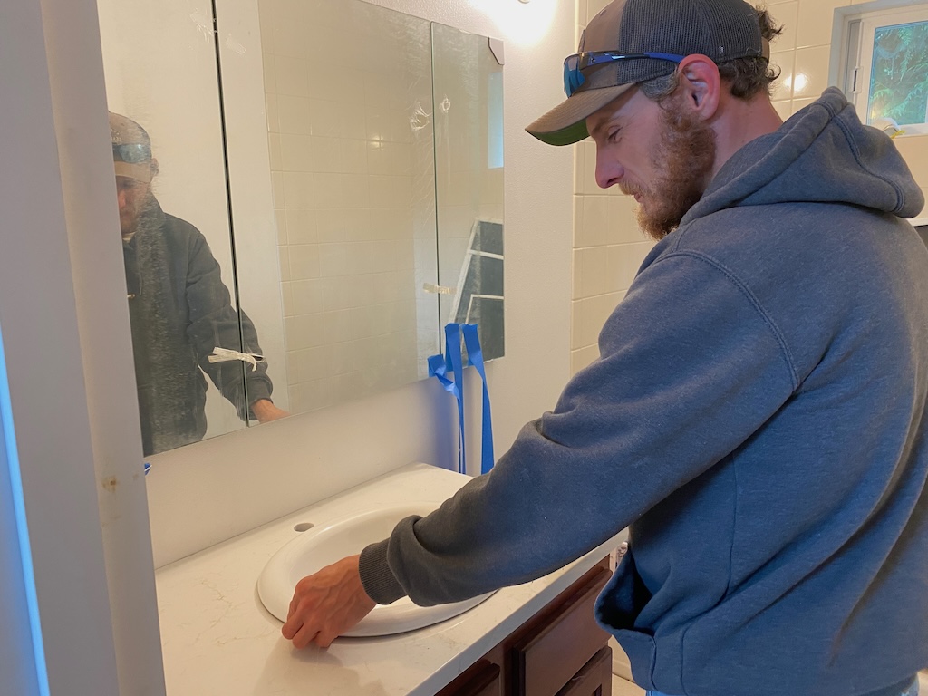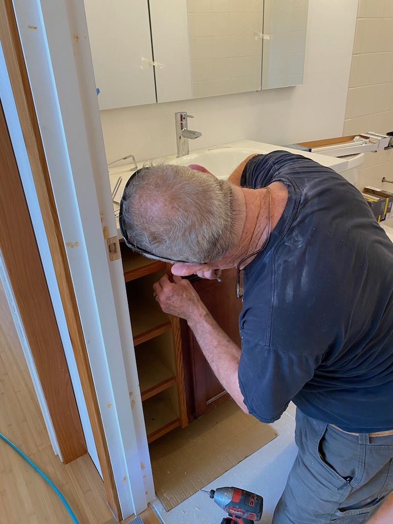 The bathroom now has a beautiful vanity top, with much appreciation to Lloyd of Fine Art Builders, and Justin who set them in. (They also installed the kitchen counters.)