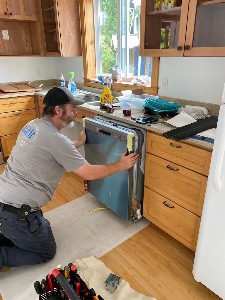 Final touches on the kitchen are completed. Dishwasher installed. Water is turned on!