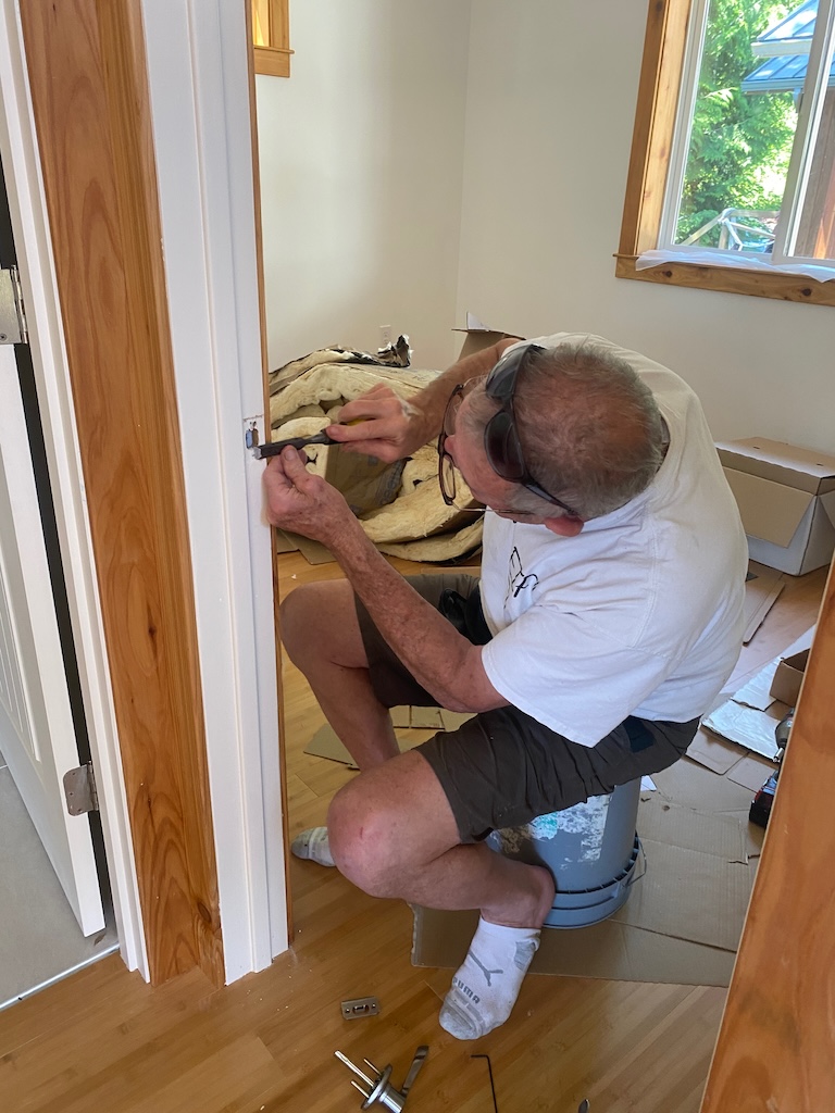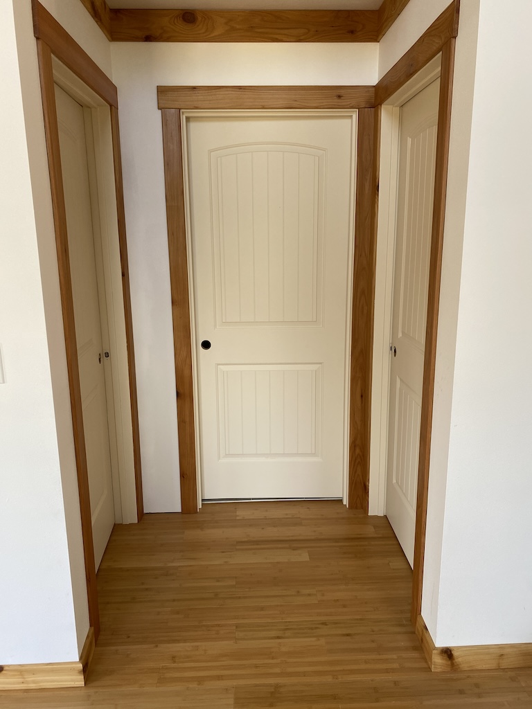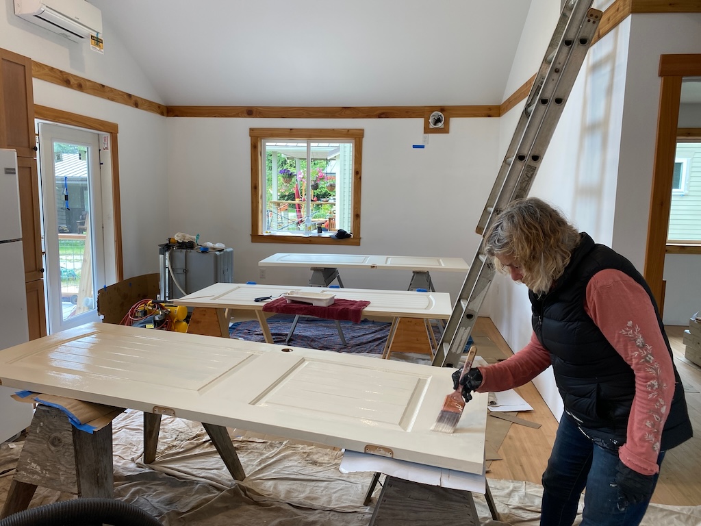 Doors are painted and hung, and door handles installed.