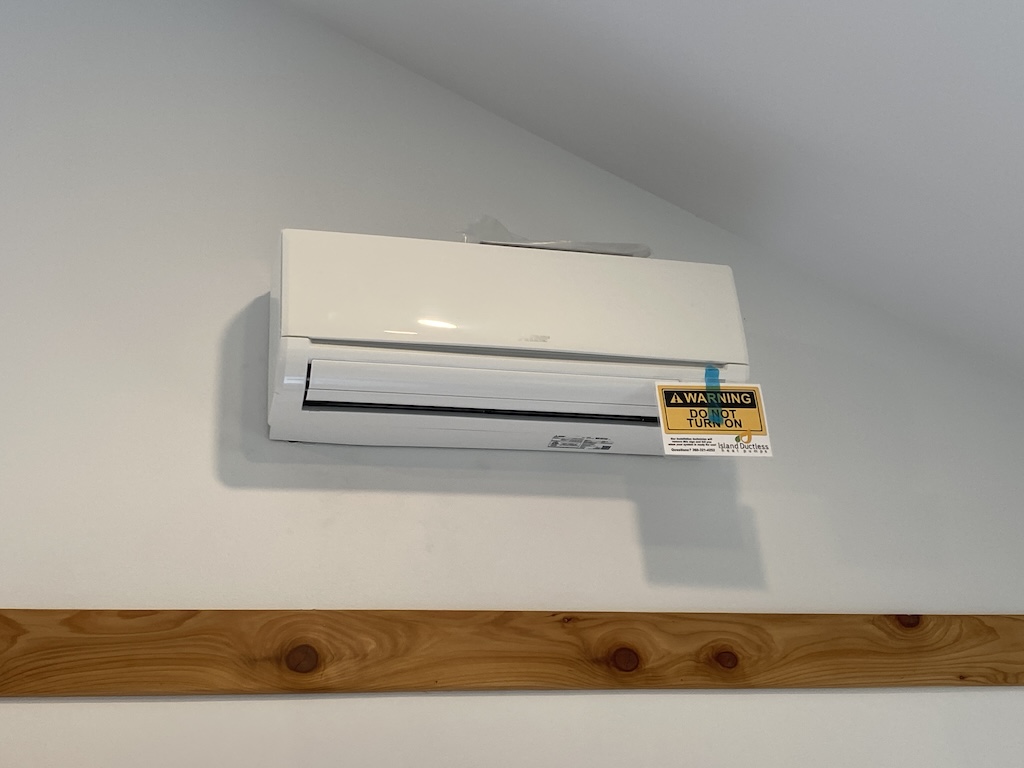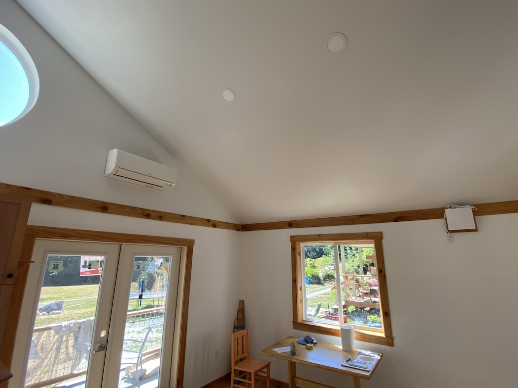 When the interior was completed, we carefully cleaned and dusted everything to protect the filters. The Island Ductless technician charged the minisplit lines with refrigerant, and our system is now ready to heat or cool, and provide clean fresh ventilation to this energy-efficient home!