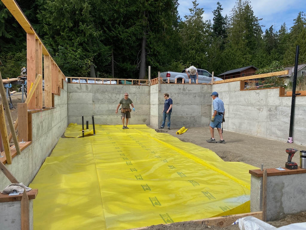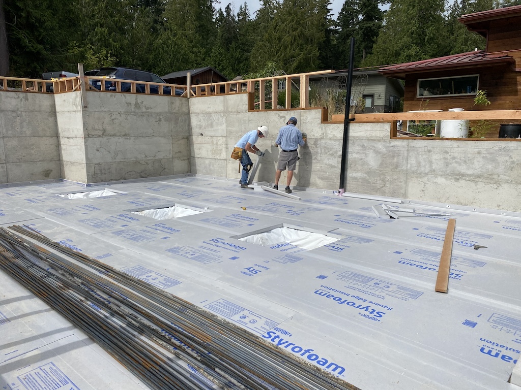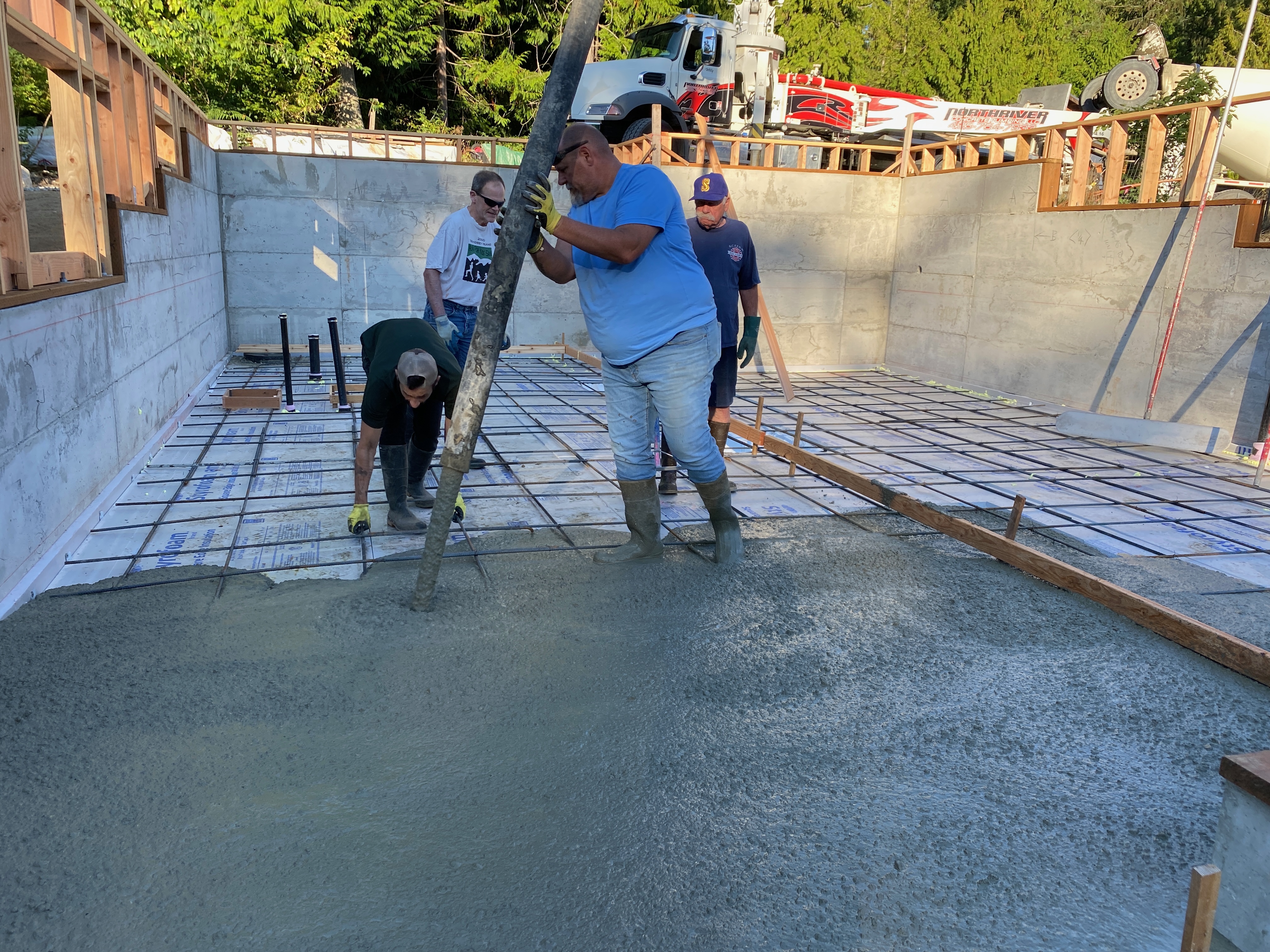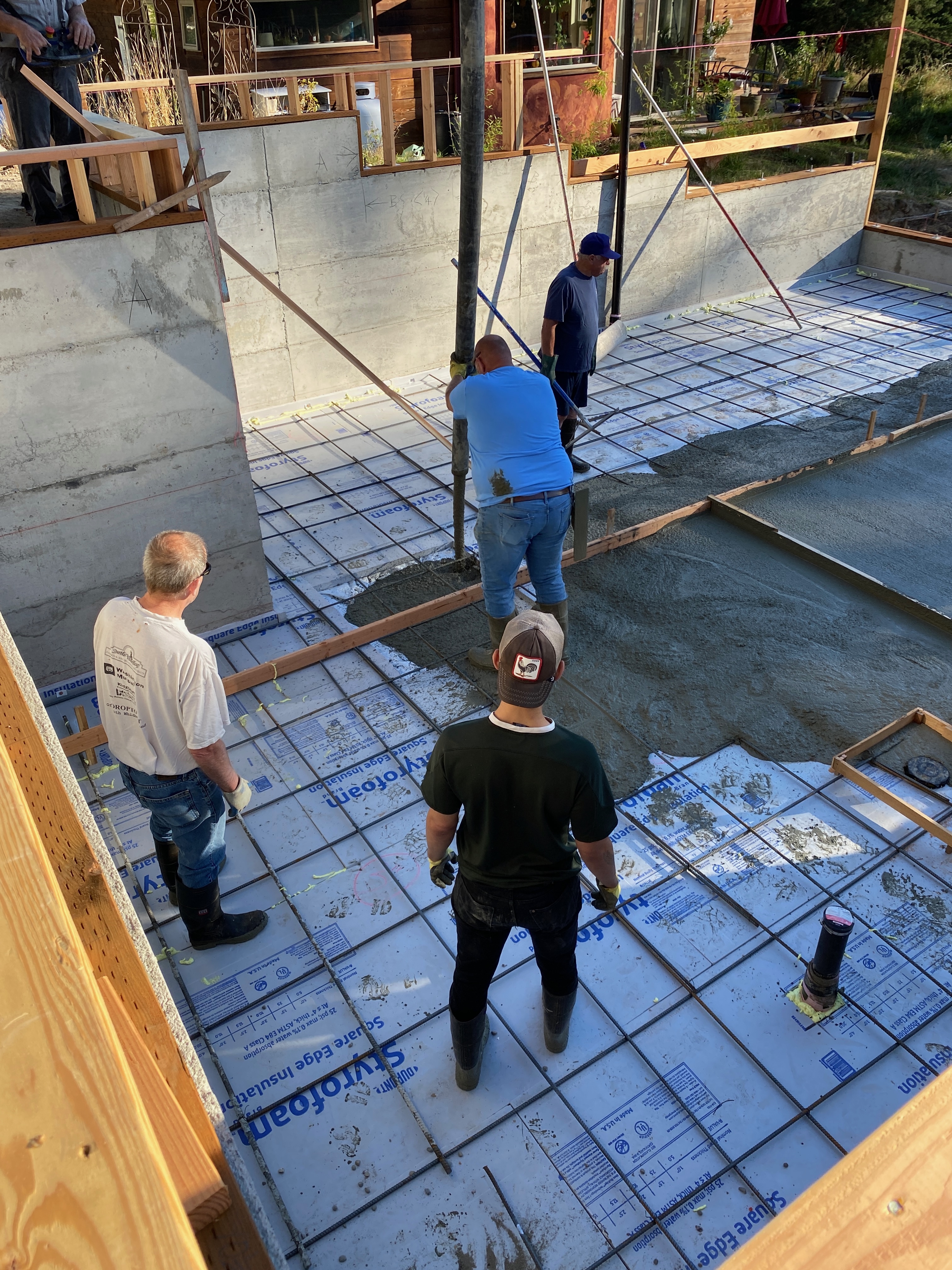 First, the foundation fill needed to be leveled and compacted, vapor barrier laid down, insulation installed, and rebar laid down. Thank you Richard, Peter, Scott, Russell, George and Joe!