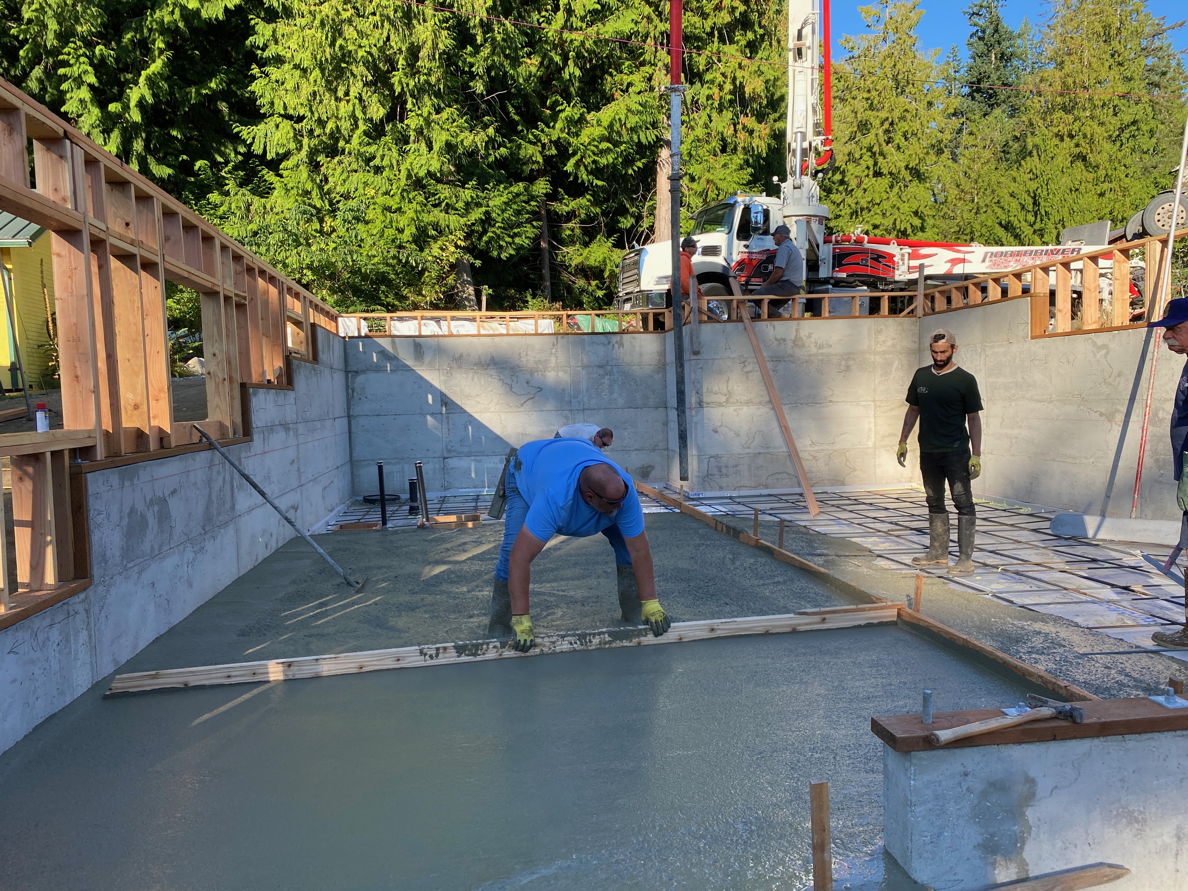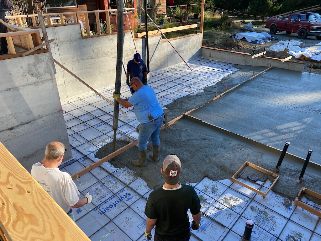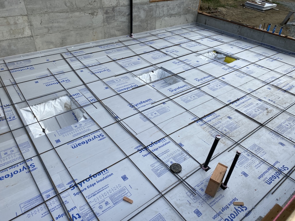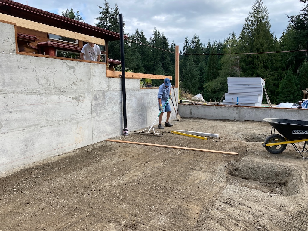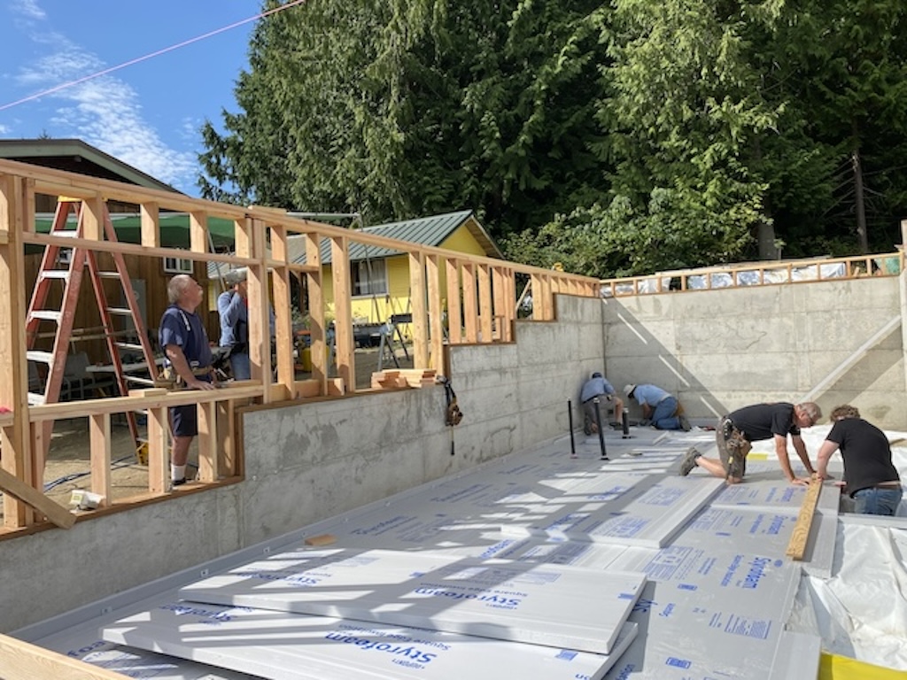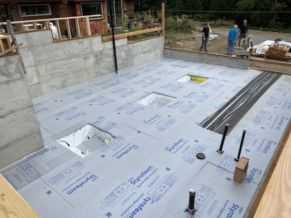 First, the foundation fill needed to be leveled and compacted, vapor barrier laid down, insulation installed, and rebar laid down. Thank you Richard, Peter, Scott, Russell, George and Joe!