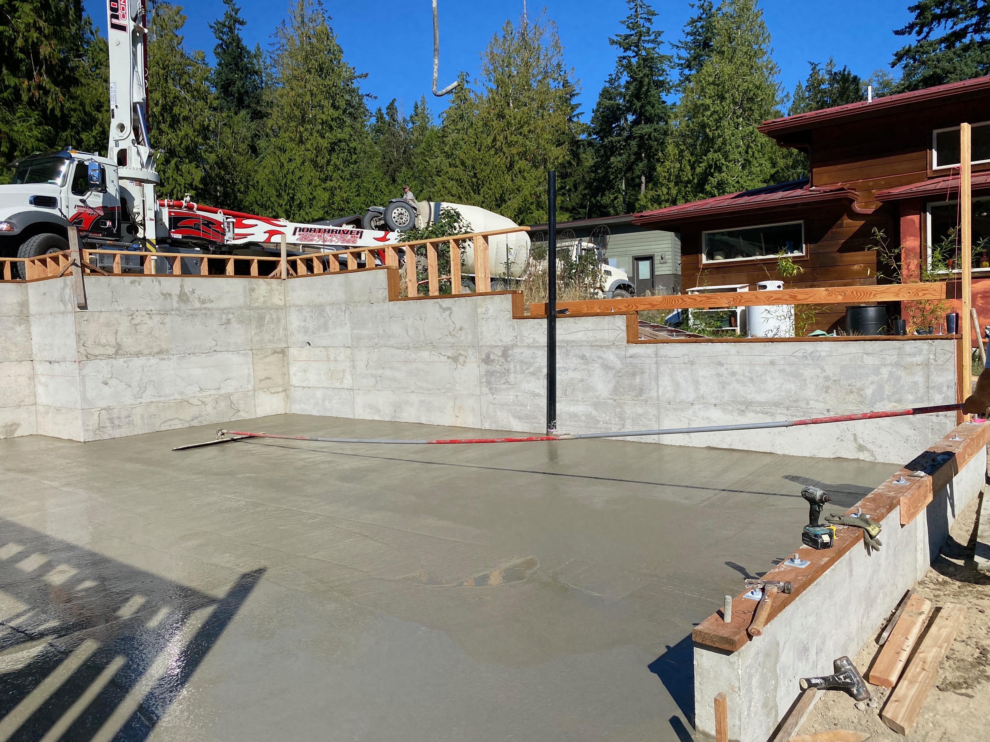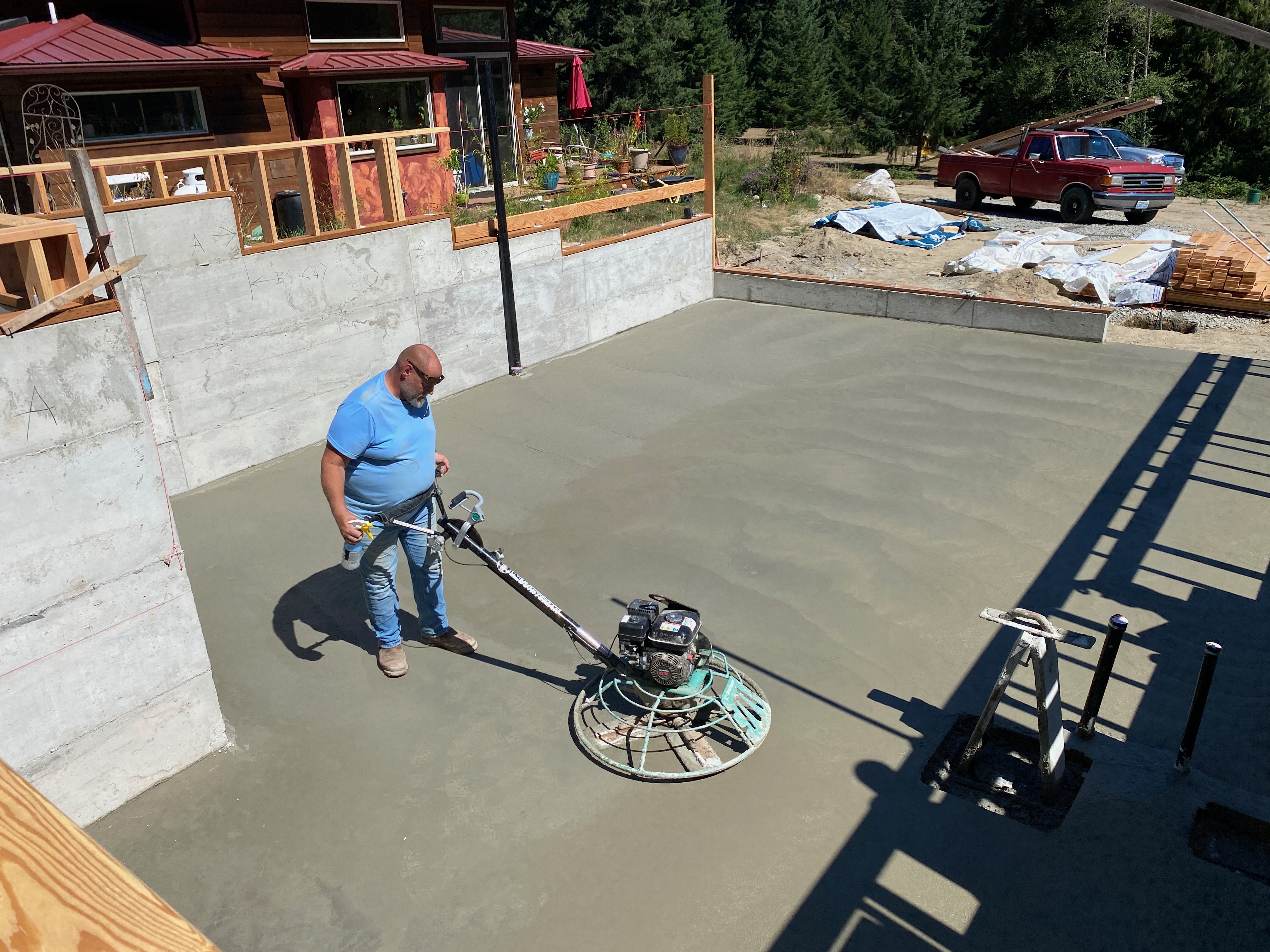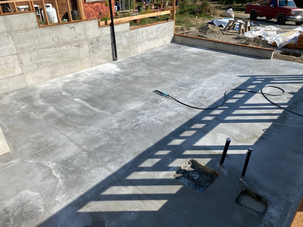 The big pump truck came for its last visit, and Steve poured the slab, making sure it was level, smoothing it out, and polishing it as it cured. The next day, he scored it, and we kept it cool by watering it and regularly testing the temperature.