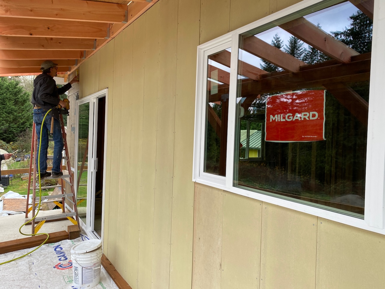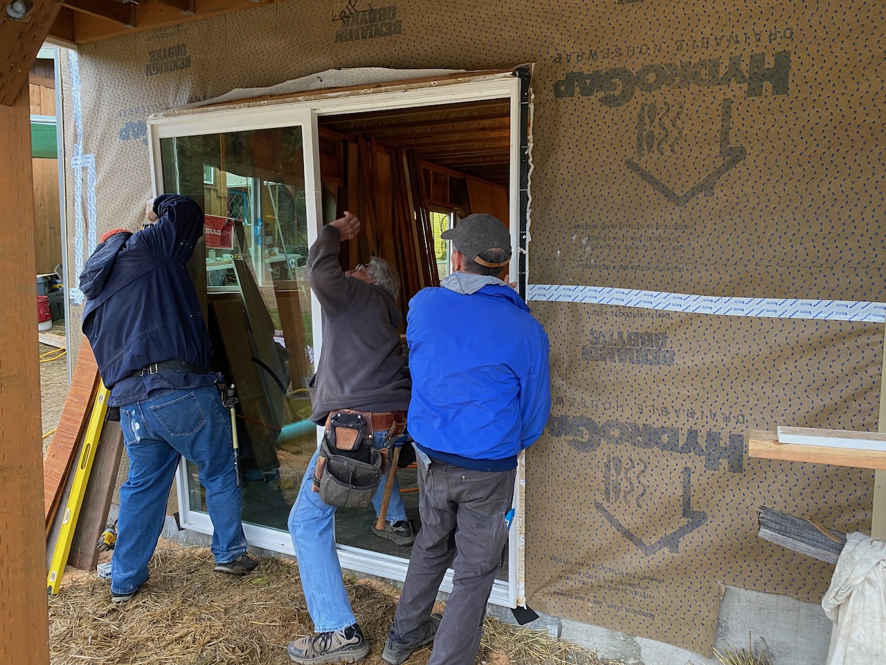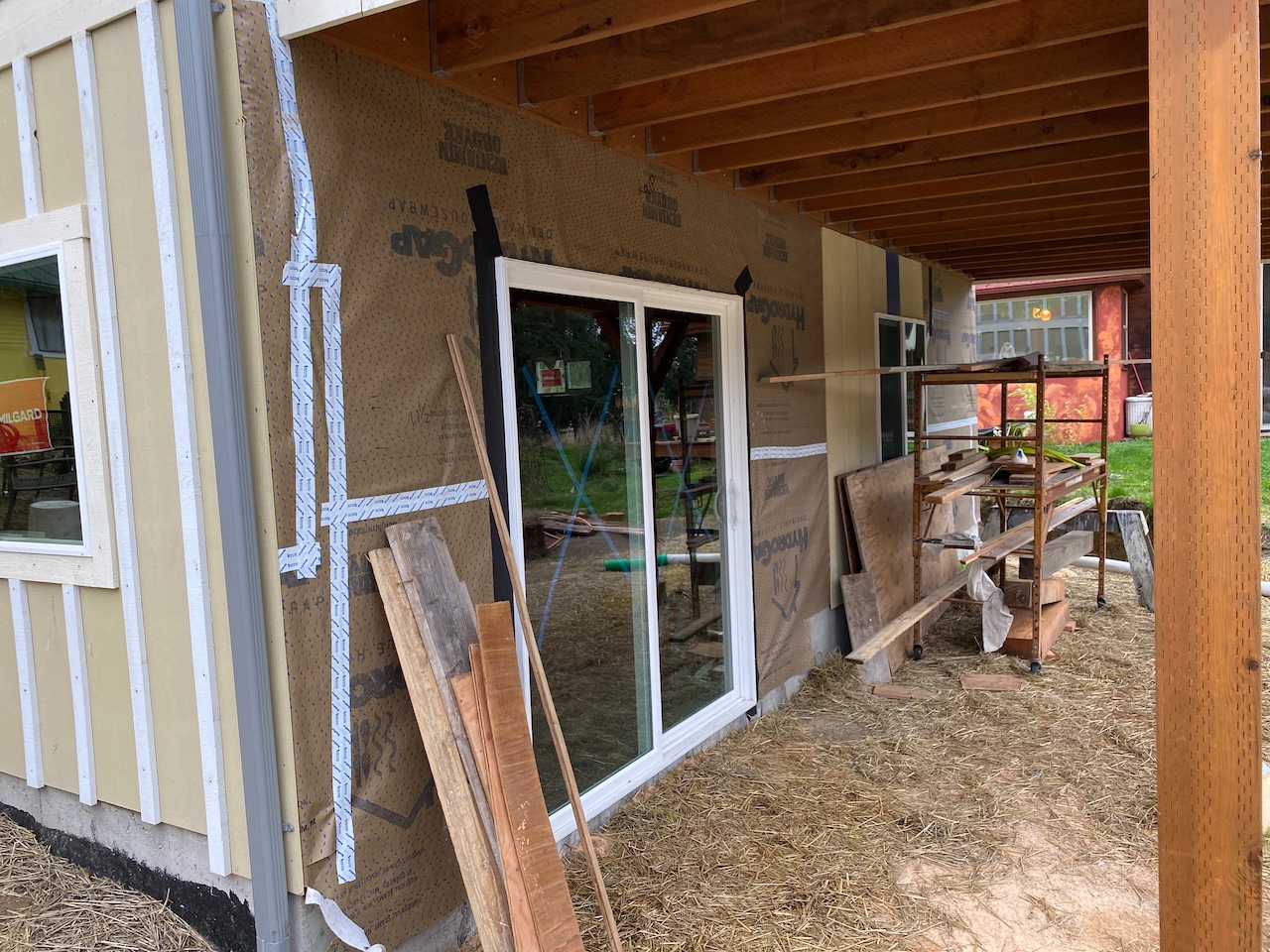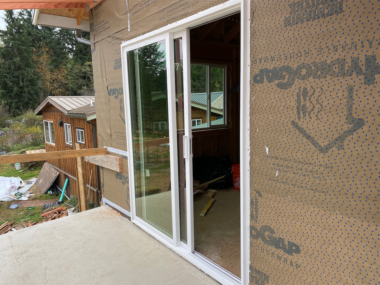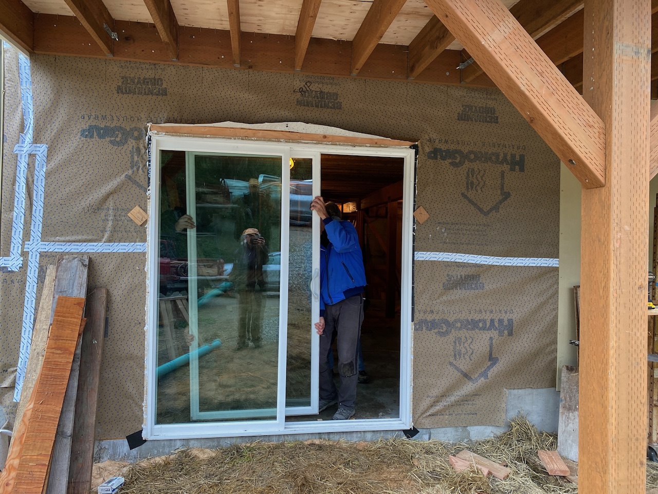 And on the east wall, first the sliding glass doors on the main and ground floors were installed,