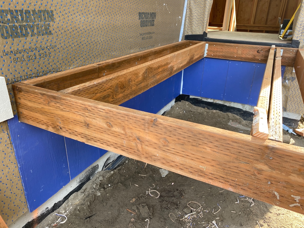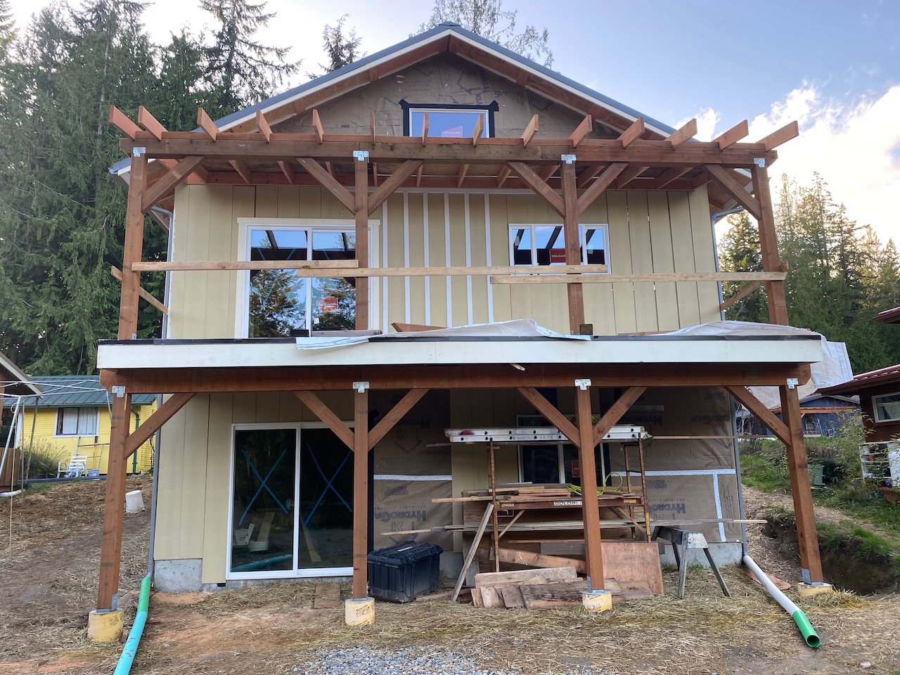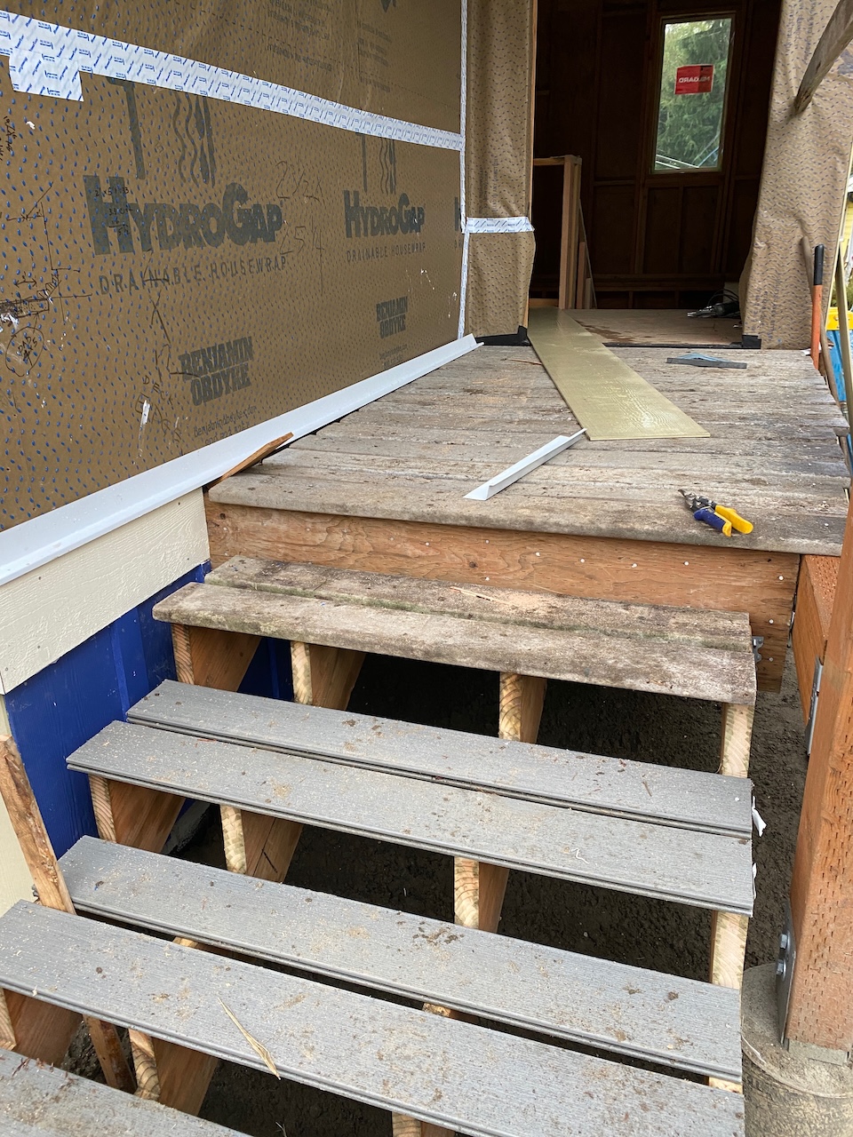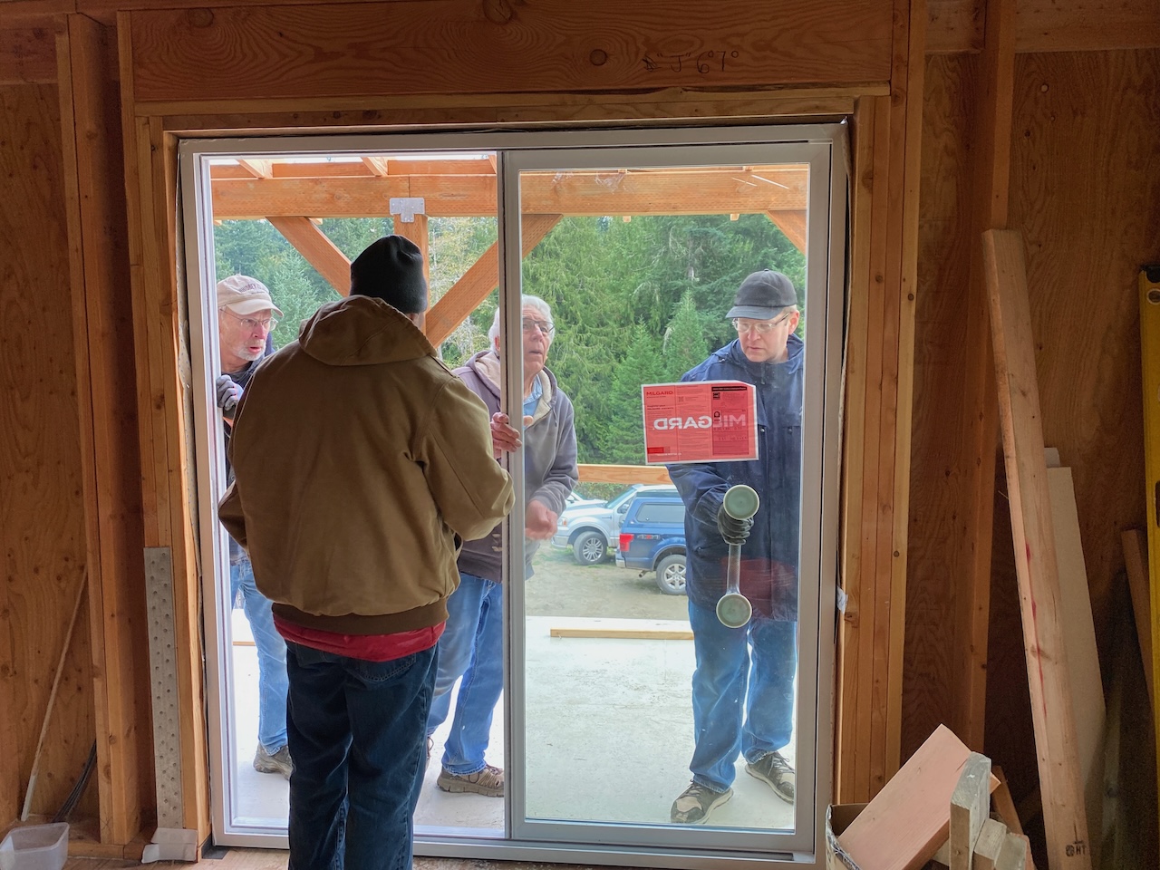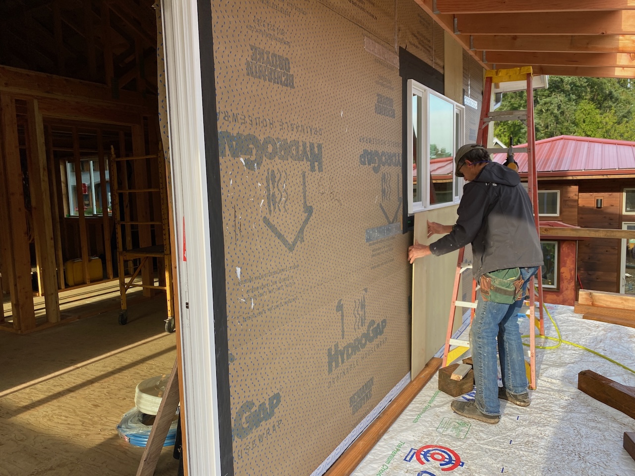 And on the east wall, first the sliding glass doors on the main and ground floors were installed,