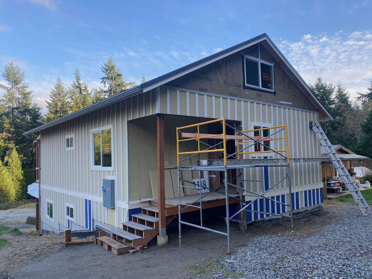 The exterior is now almost finished! We’ll return in January to finish the gables and east wall siding, and go full speed ahead on plumbing and electrical.